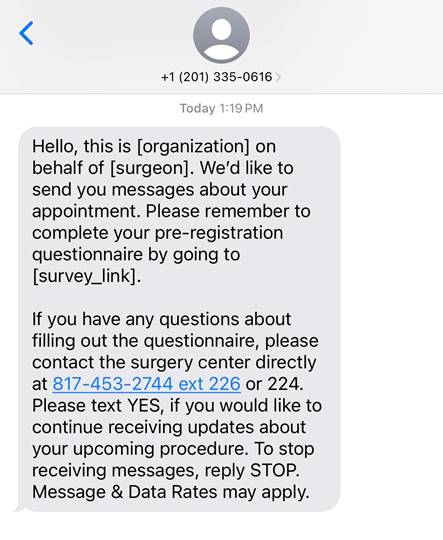 You will be contacted via text message with a unique survey link. You must op-in (reply “yes”) to receive further text messages. If your physician’s office has provided us with your email address, you will also receive this link via email. This link is unique to you and for you to complete your medical history assessment. Please complete this as soon as possible, so that anesthesia may review your medical history and avoid delays or cancelations on the date of your procedure.